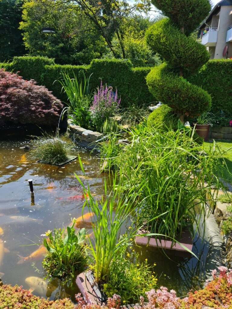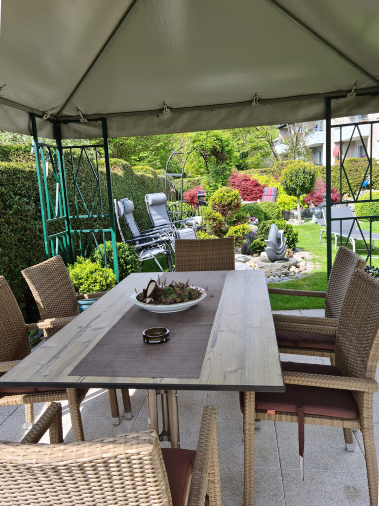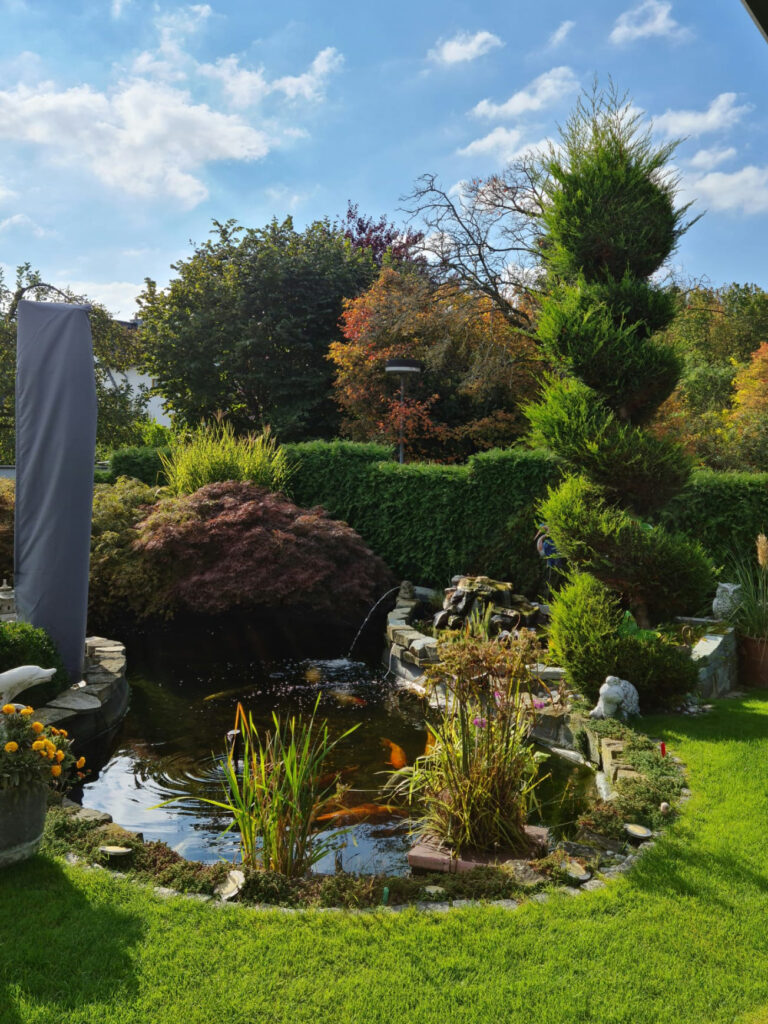 Zum Entspannen laden wir Sie in unseren liebevoll gepflegten Garten, mit kleiner Teichanlage und Pavillon ein.